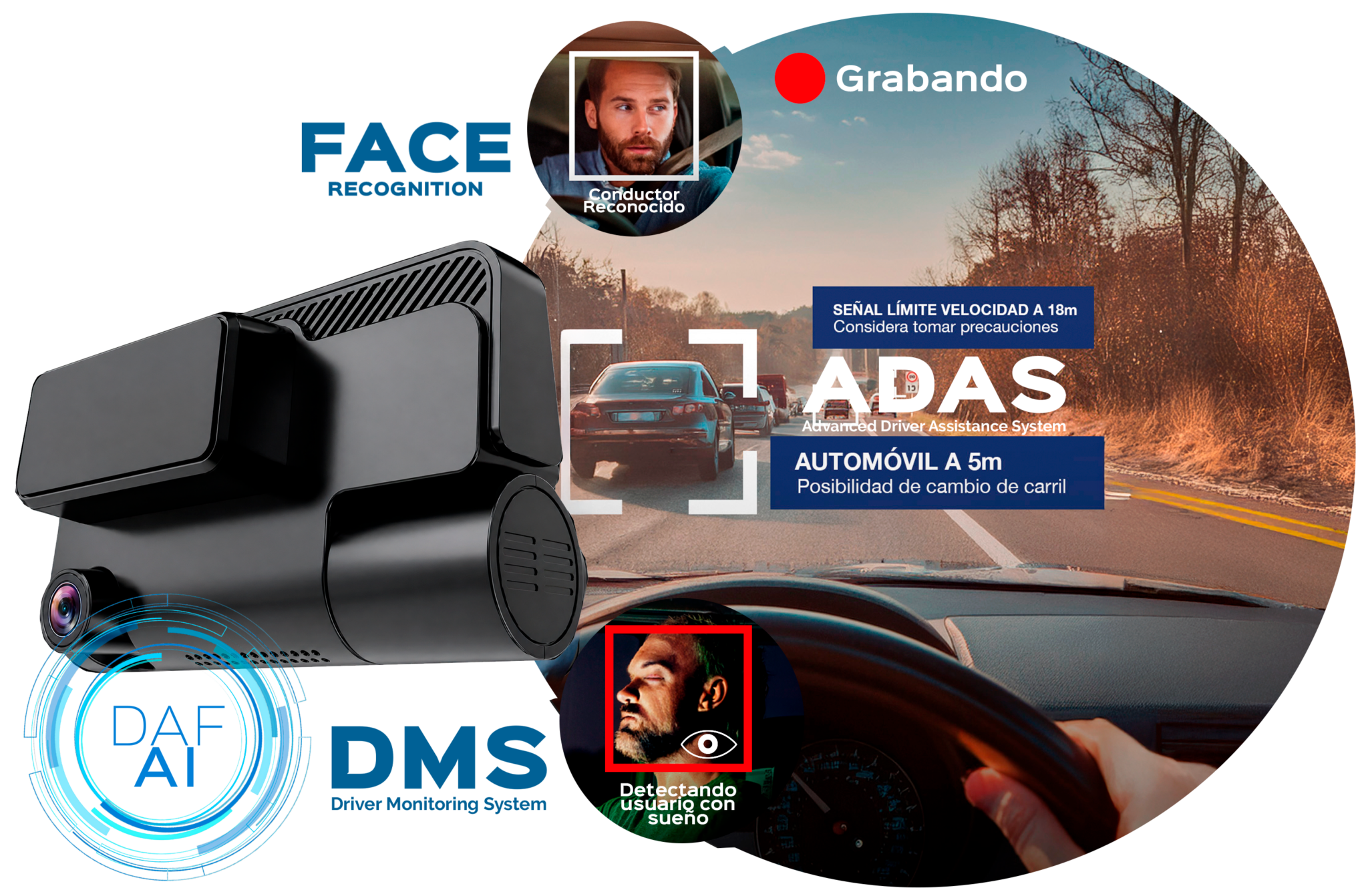 DAF es el acrónimo para DMS, ADAS y Face Recognition. Son funciones de inteligencia artificial diseñadas para ayudar a una mejor conducción.