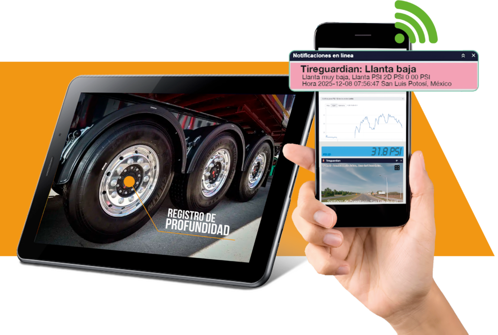 Tireguardian optimiza la vida de tus llantas monitoreando en tiempo real la presión y temperatura 24/7.